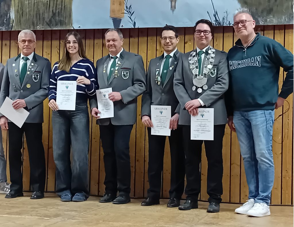 Bei den anschließenden Ehrungen erhielten Volker Gauderer und Timo Schmeisser für ihre Verdienste um das deutsche Schützenwesen den „Kleinen Greif in Gold“ bzw. den „Kleinen Greif in Silber“ des Badischen Sportschützenverbandes. Zehn Mitglieder wurden für ihre Treue zum Verein ausgezeichnet. Für 15 Jahre Mitgliedschaft erhielten Dominik Volz, Christopher Aras und Julian Aras die Vereinsehrennadel. Für 25-jährige Mitgliedschaft erhielten Marcel Molitor und Marco Molitor die silberne Ehrennadel des Badischen Sportschützenverbandes. Bereits 40 Jahre im Verein sind Adelheid Benz, Wolfgang Ackermann, Georg Benz und Markus Grittmann. Sie erhielten ebenso wie Henrik Benz für 50-jährige Mitgliedschaft die goldene Ehrennadel des Badischen Sportschützenverbandes.